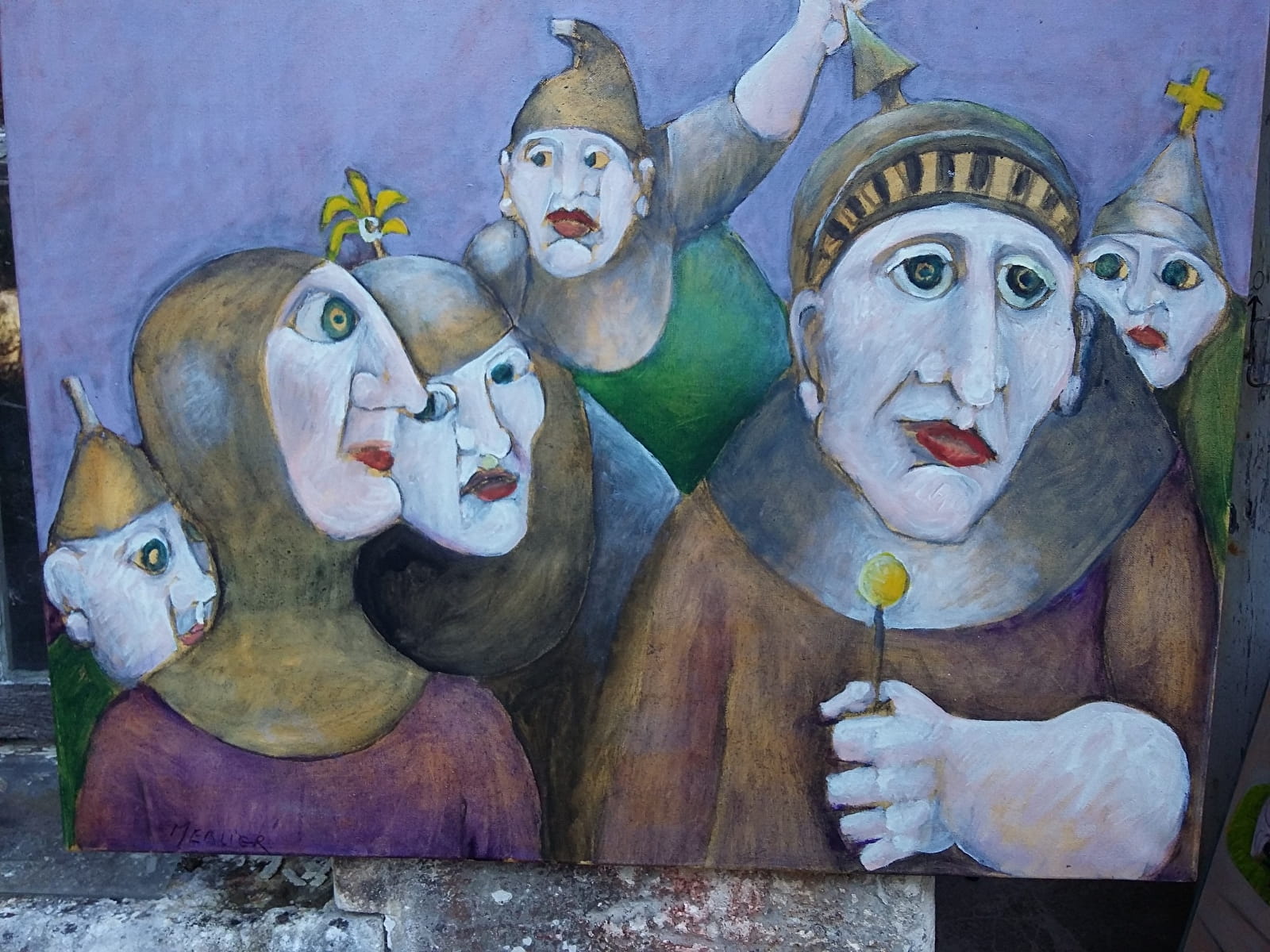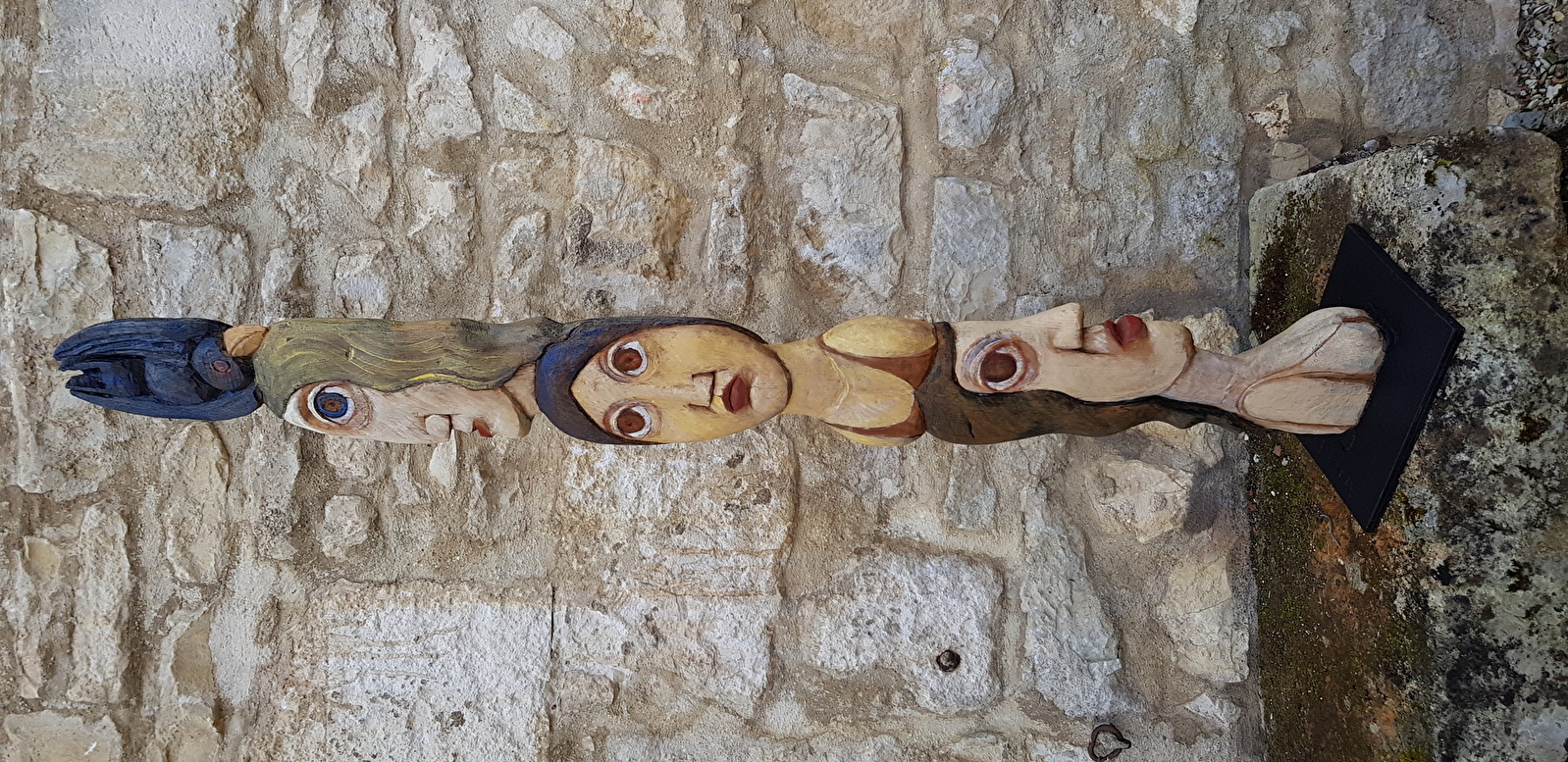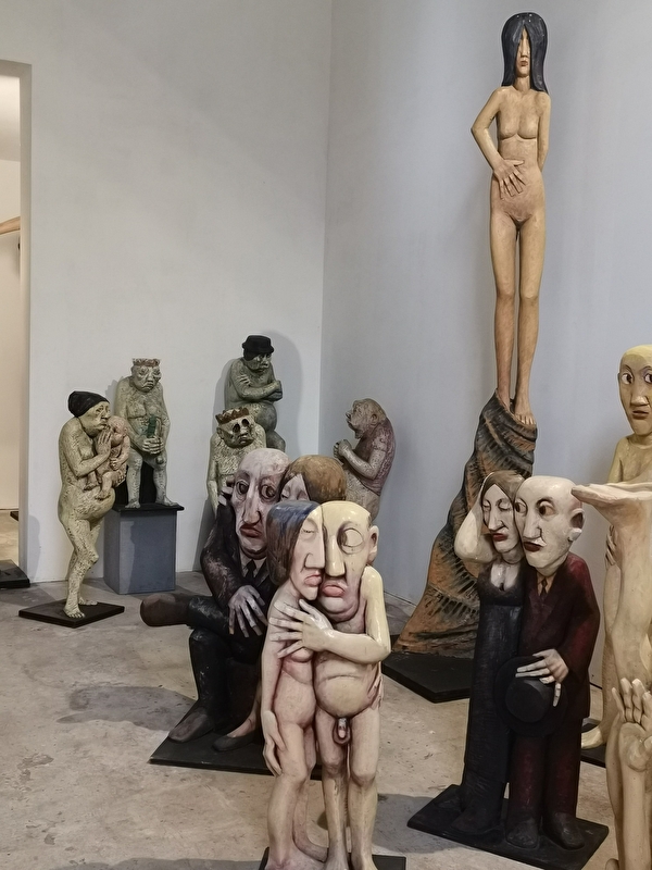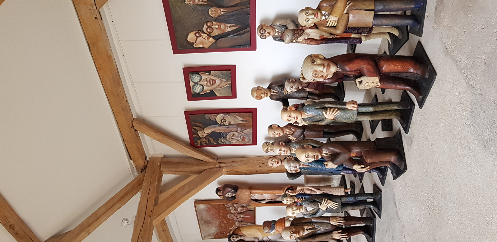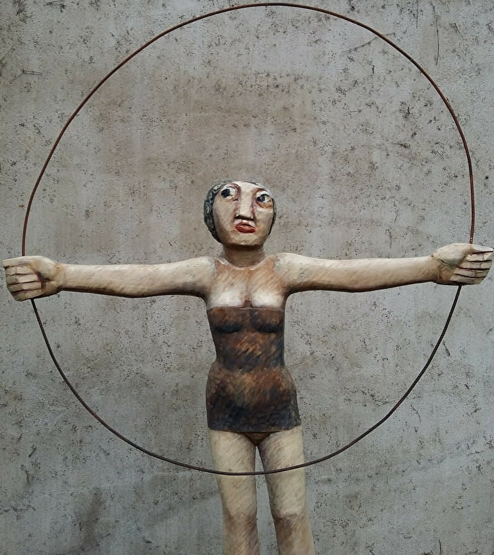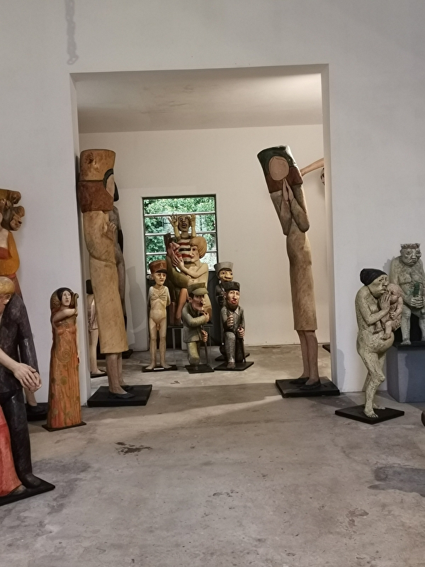Mise en scène théâtrale de plus de 300 sculptures bois. "Chêne, tilleul, orme, cerisier, essence exotique, les figures émergent ironiques comme la famille des "banquiers" parmi lesquels on note quelques femmes mais aussi oniriques, chimériques , comme les orantes, des femmes drapées dans des voiles . Chaque fois , il s'agit de respecter ce que l'arbre offre, jouer avec la forme, l'inventer avec dérision et poésie. Les souches et leurs racines deviennent têtes, elles s'élancent vers le ciel, tandis que le corps pris dans le tronc de l'arbre semble s'ancrer délicatement dans le sol, pieds longs, aussi longs que les mains sont fines et les cous sont allongés, têtes posées là -dessus, visages dans un jeu de vérité "