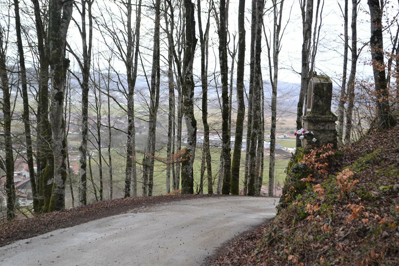 En montant en direction des réservoirs de Dommartin vers la Côte du Fol, sur la gauche, se trouve posé sur la roche au bord de la route un oratoire de 1.75 m de haut présentant une base sur laquelle vient s’appuyer un soubassement fait d’un dé épais surmonté d’une pierre plate. Cet oratoire est composé d’une niche largement ouverte en arc à peine brisé, elle-même fermée par une grille.
