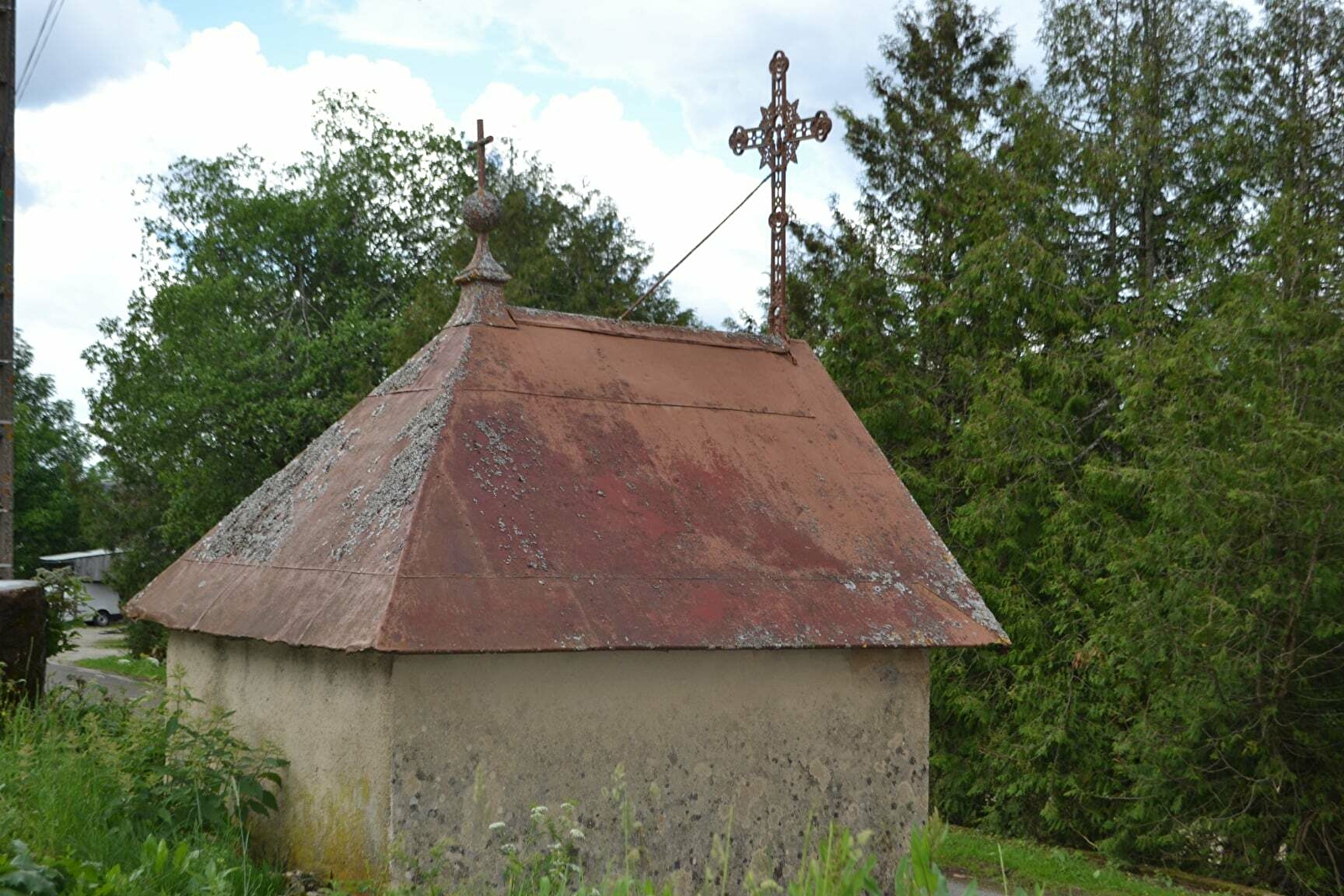 A la sortie du village, sur la route d’Oye-et-Pallet, une petite construction large de 2.20 m et profonde de 2.35 m, crépie, portant une toiture à 3 pentes, deux latérales et une arrière, couverte de tôle peinte.