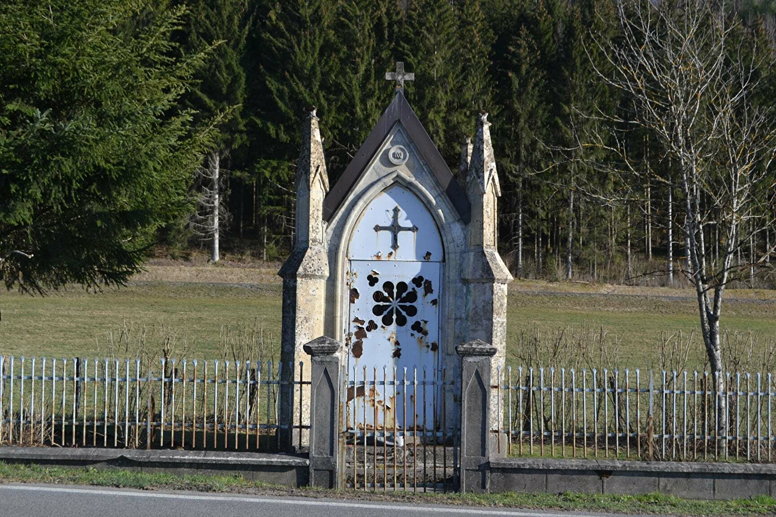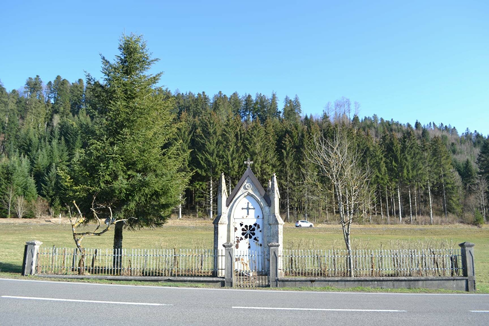 Sur la route d’Arçon, peu avant le carrefour de la route de Pontarlier à Morteau, dans un bouquet d’arbres et entouré d’un muret surmonté d’une grille, cet oratoire en pierres de plan carré est haut de 4 m environ et flanqué aux 4 angles de contreforts rayonnants qui prennent naissance à la base du toit à 2 pentes, en pierre. Quatre pinacles les surmontent. La croix sommitale est tombée. En façade, une baie en lancette bordé d’une petite voussure et soulignée d’un boudin est fermée par une porte de fer ajourée d’une rose à huit lobes, cantonnée de trèfles et par une imposte dormante dans laquelle est découpée une croix grecque fleuronnée. Dans un médaillon au-dessus de la porte, on lit le monogramme marial et en bas et à gauche de la porte la date de 1866. A l’intérieur, deux crédences, une forte pile supporte la statue de Notre-Dame de la Salette.