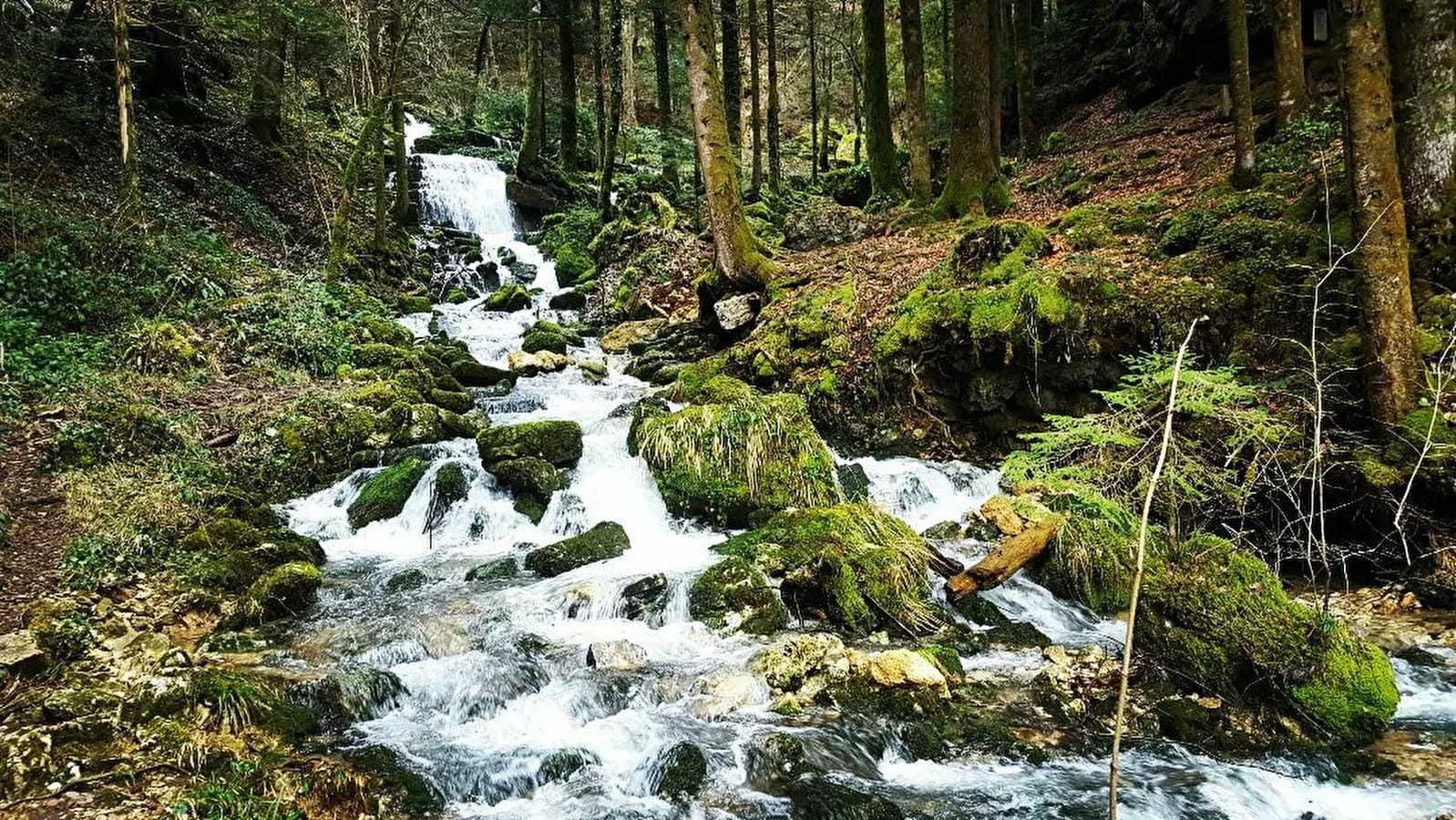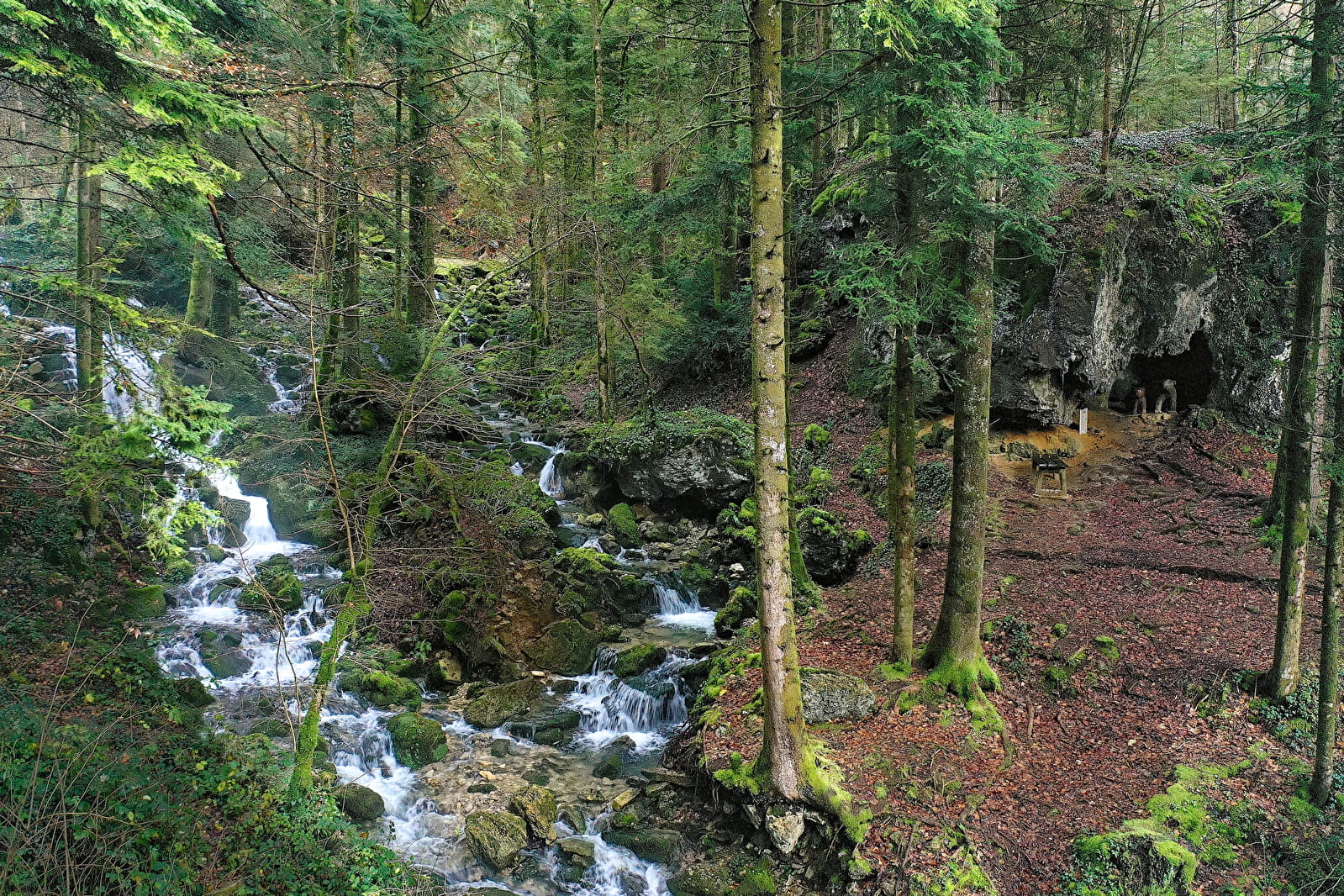 Depuis le magnifique clocher comtois du village, c’est jusqu’à sa source que vous remonterez l’Angillon, affluent de l’Ain. Au bout du chemin, dans un cirque rocheux, vous longerez une suite de petites cascades. C’est à partir d’ici que la féerie s’opère… Abandonnez la petite route pour emprunter le sentier forestier, sans oublier de jeter un coup d’œil de l’autre côté de la rivière, où une petite grotte est occupée par… deux ours !