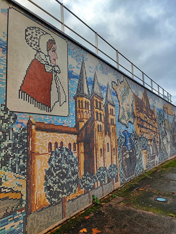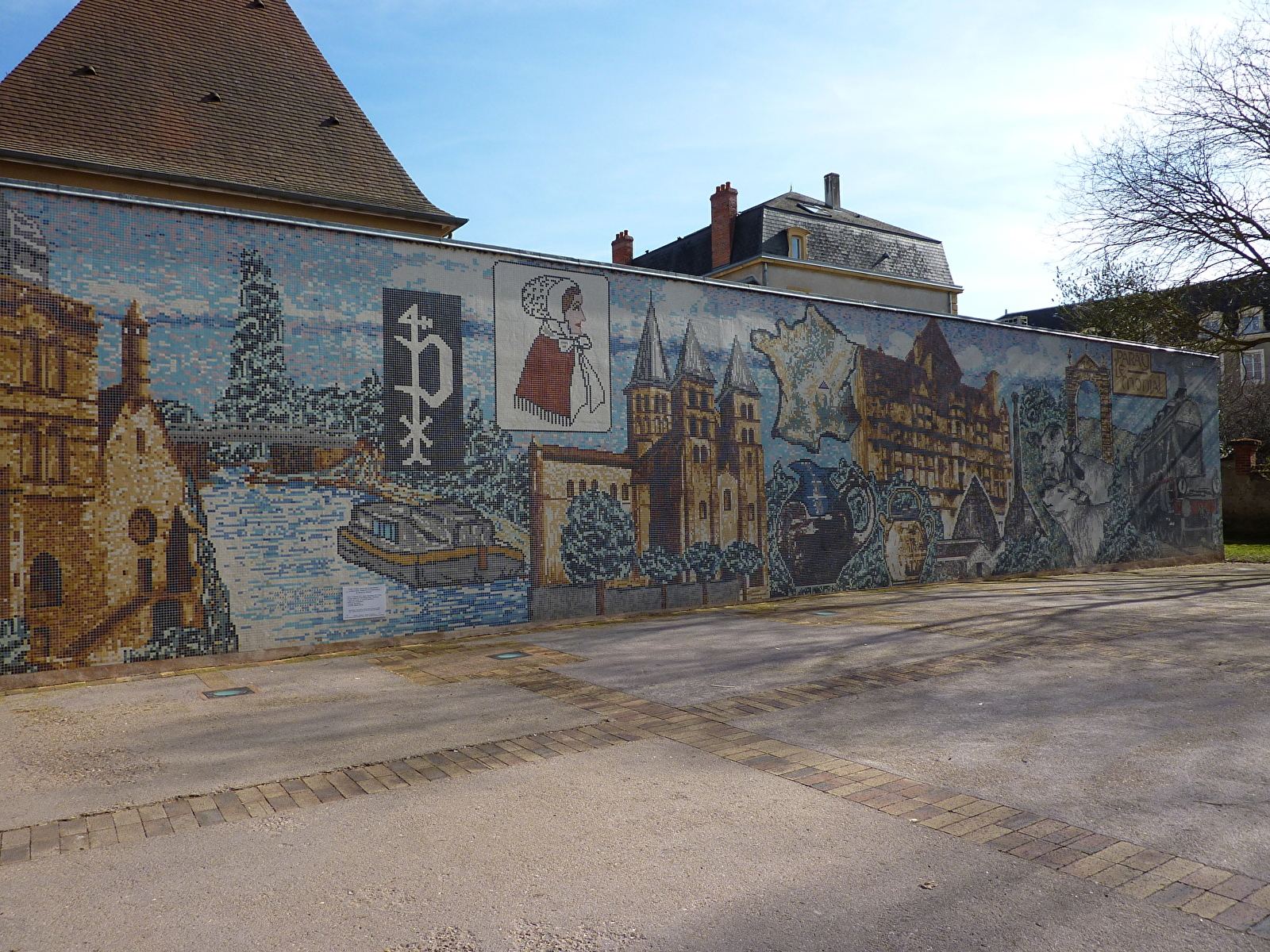 Ce petit square est orné d’une mosaïque commandée en 1997 par la ville aux membres de l’Association Paul Charnoz. Ce décor mural, composé de 165 141 carreaux de grès céramique, présente le patrimoine architectural, industriel et économique de Paray-le-Monial : de la tour Saint-Nicolas au chemin de fer en passant par le canal, la basilique, l’hôtel de ville, l’industrie céramique et l’élevage charolais.