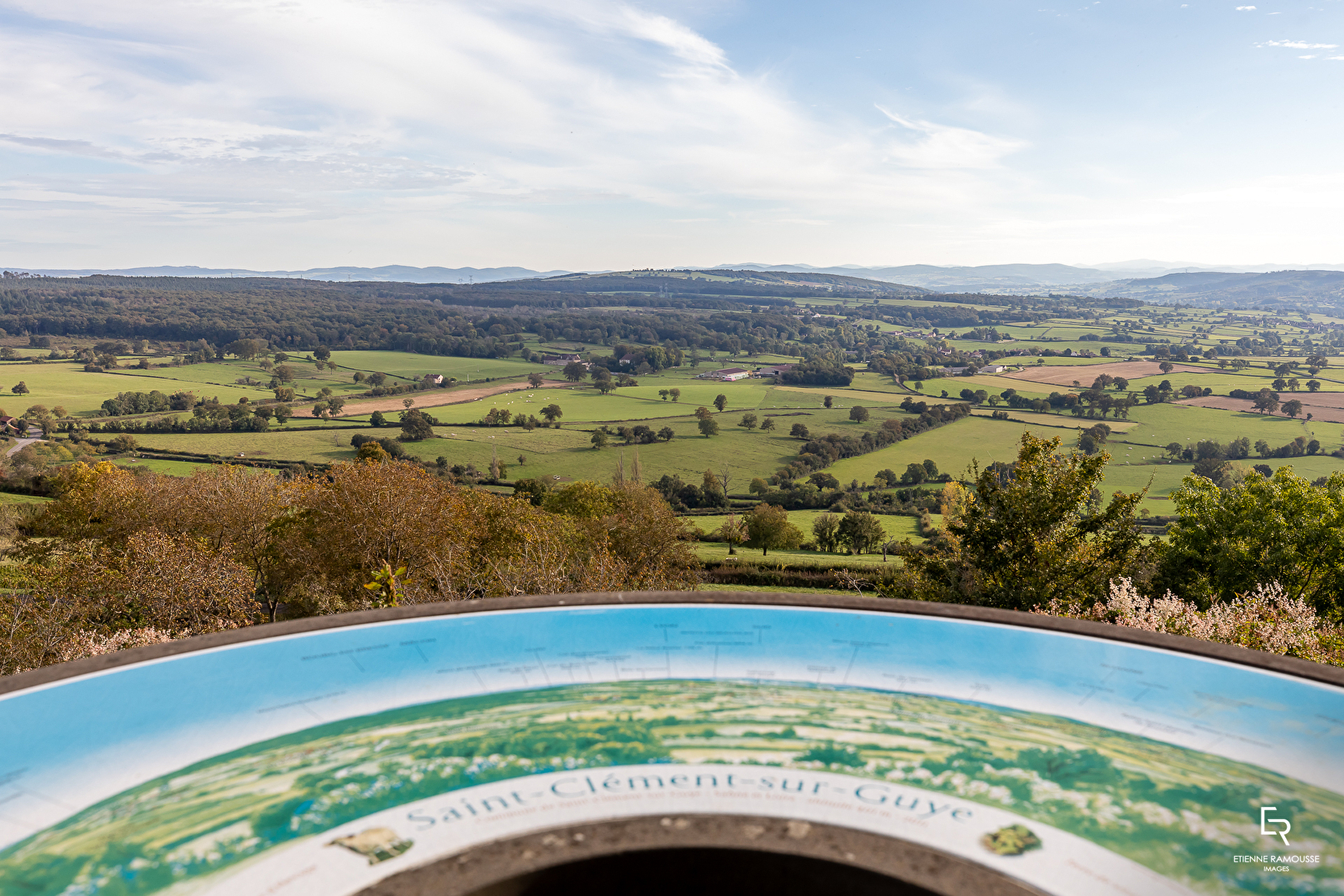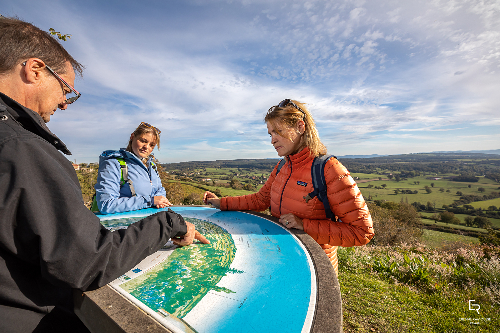 Table à 180° située dans le village, au lieu-dit "La Poraire" à 401 mètres d'altitude (parking à proximité de la salle communale). Le panorama offre une vue sur les monts du Mâconnais et du Charolais. Les forêts dans le lointain succèdent aux prairies où paissent les vaches charolaises. En contrebas, on aperçoit le tracé de la voie romaine entre la Grenouille et l'Effondrée.