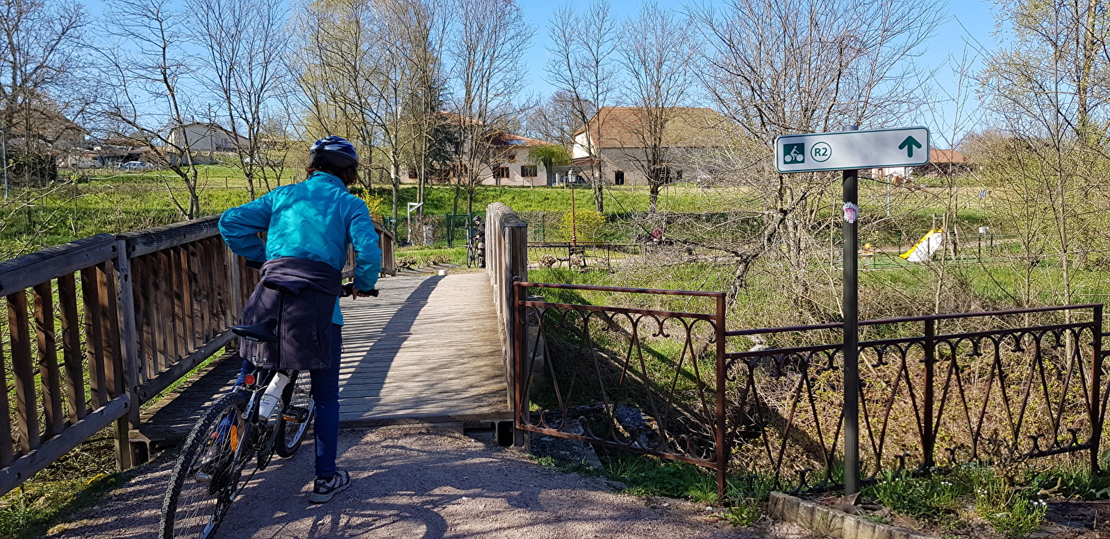 À Cornillon, on quitte le canal pour emprunter un itinéraire constitué de petites routes. Quelques efforts à travers prés et c'est la récompense qui se profile au loin : les toitures de l'église de La Bénisson-Dieu si reconnaissable avec ses couleurs vives et ses motifs géométriques travaillés. Celle du clocher apparait en premier, puis celle de la nef.
