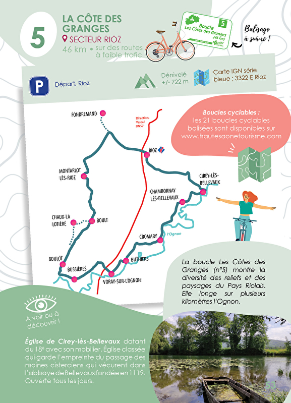 La boucle Les Côtes des Granges (n°5) montre la diversité des reliefs et des paysages du Pays Riolais. Elle longe sur plusieurs kilomètres l’Ognon.