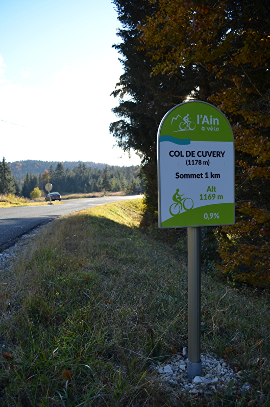 Le Col de Cuvéry (1 178 m) depuis Vouvray (Valserhône, anciennement Bellegarde/Valserine) relie la vallée de la Valserine à la vallée du Séran. Montée douce avec une pente très régulière sans difficultés majeures (% maxi à 7.0 %) avec de nombreux passages en forêts pour arriver sur une vaste combe typique du relief jurassien, et propice à la pratique des activités nordiques en hiver. Parcours idéal pour découvrir le Plateau de Retord avec une magnifique vue sur les Alpes à Catray. Au sommet très beau panorama sur la vallée de la Valserine, le Jura franco-suisse et le Mont-Blanc. Jonction avec le col de Bérentin après la descente en direction Nantua.