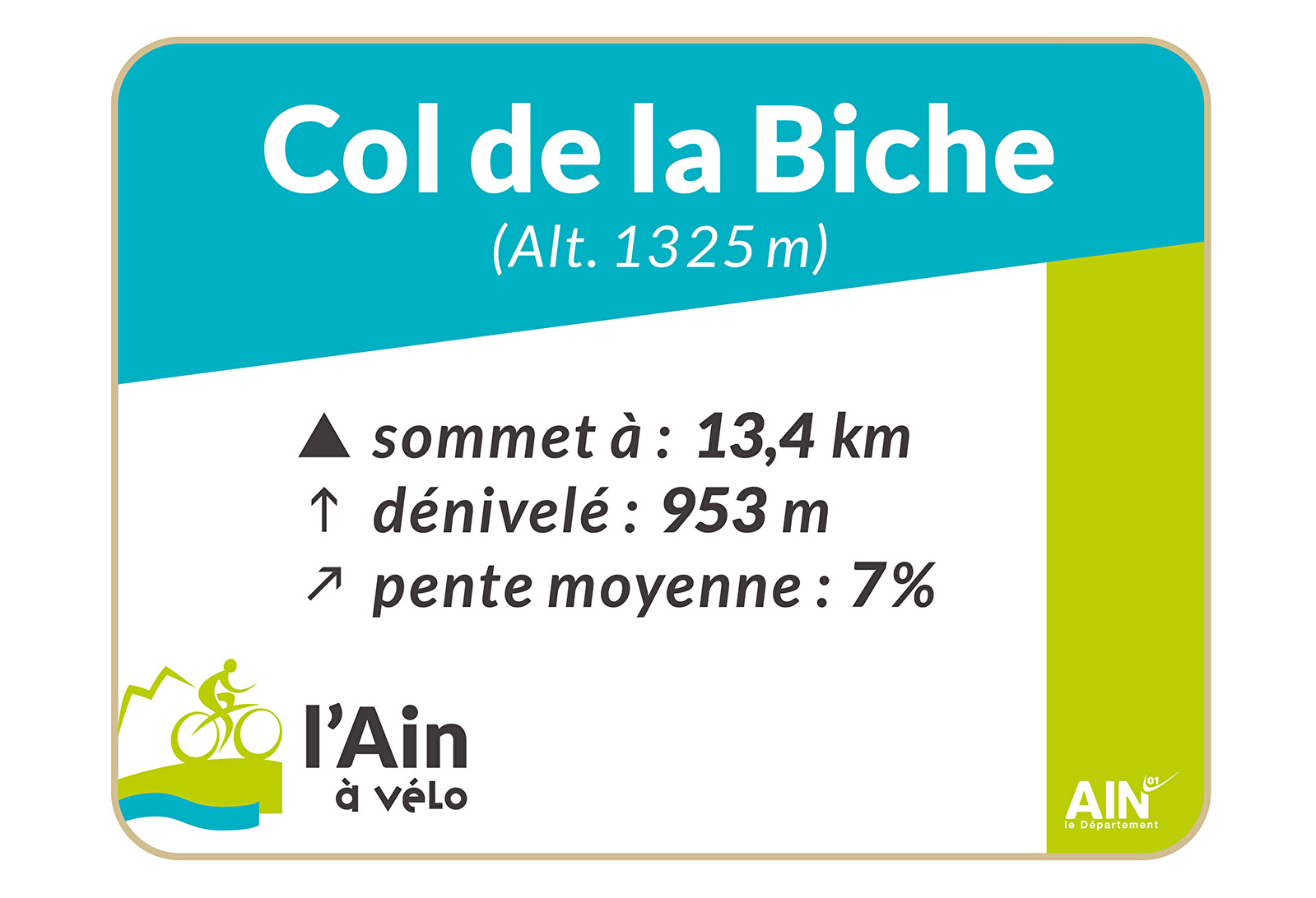 Le col de la Biche ou Golet de la Biche (1 325 m) col redoutable (13,4 km d’ascension pour 953 m de dénivelé depuis Gignez) situé dans le chaînon du Grand Colombier offre une montée régulière dans un environnement forestier avec des pentes autour des 8-10 % dès le départ de Gignez (commune de Corbonnod), jusqu’à 12% au quatrième kilomètre avant de retomber légèrement jusqu’au sommet, avec même une descente au douzième kilomètre. Le sommet offre le plaisir d’une vue panoramique sur le Mont-Blanc et les sommets alpins.