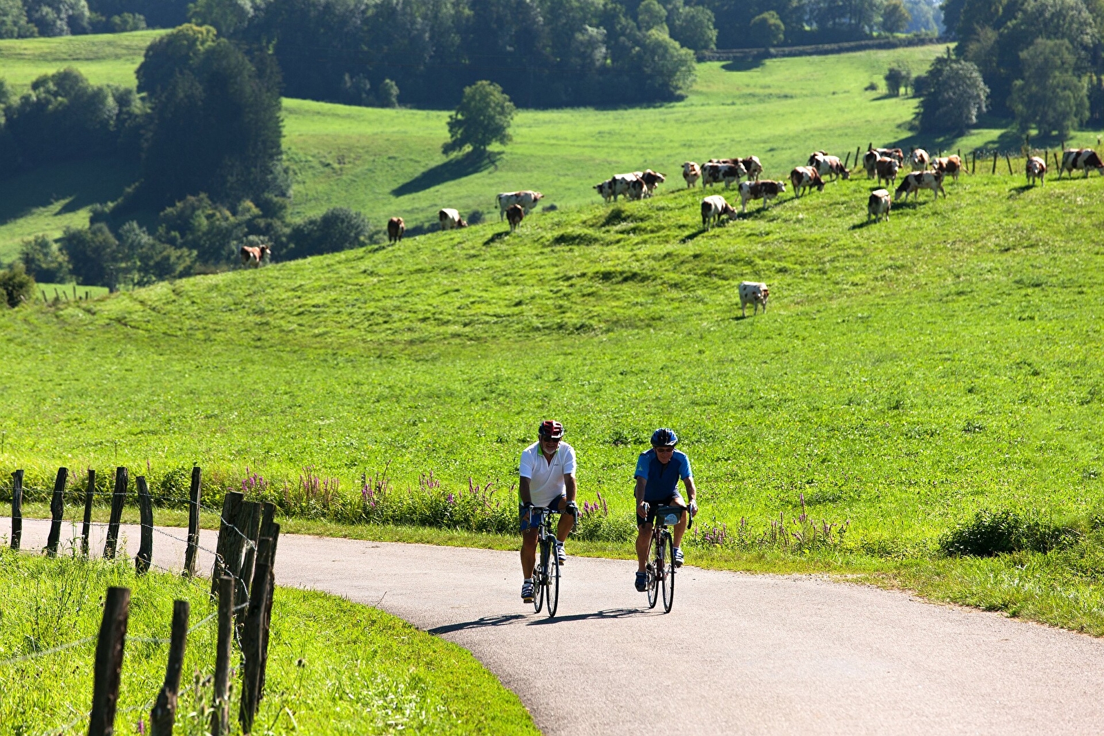 Au départ de Lons-le-Saunier, ville thermale et préfecture du Jura, où sont nés le compositeur de la Marseillaise, Claude Rouget de Lisle et la Vache Qui Rit, cette étape vous invite à prendre un peu de hauteur. Découvrez les toutes petites routes du premier plateau et de la Petite Montagne traversant les prairies vallonnées du Jura, où se prélassent nos vaches à Comté, les Montbéliardes. Entre fermes et pâtures, vallons et rivières, prenez le temps d’apprécier cette belle étape à l’accent pastoral.