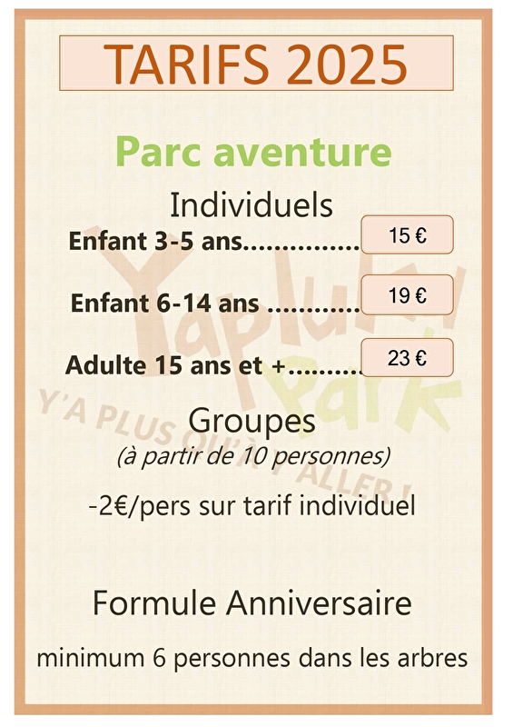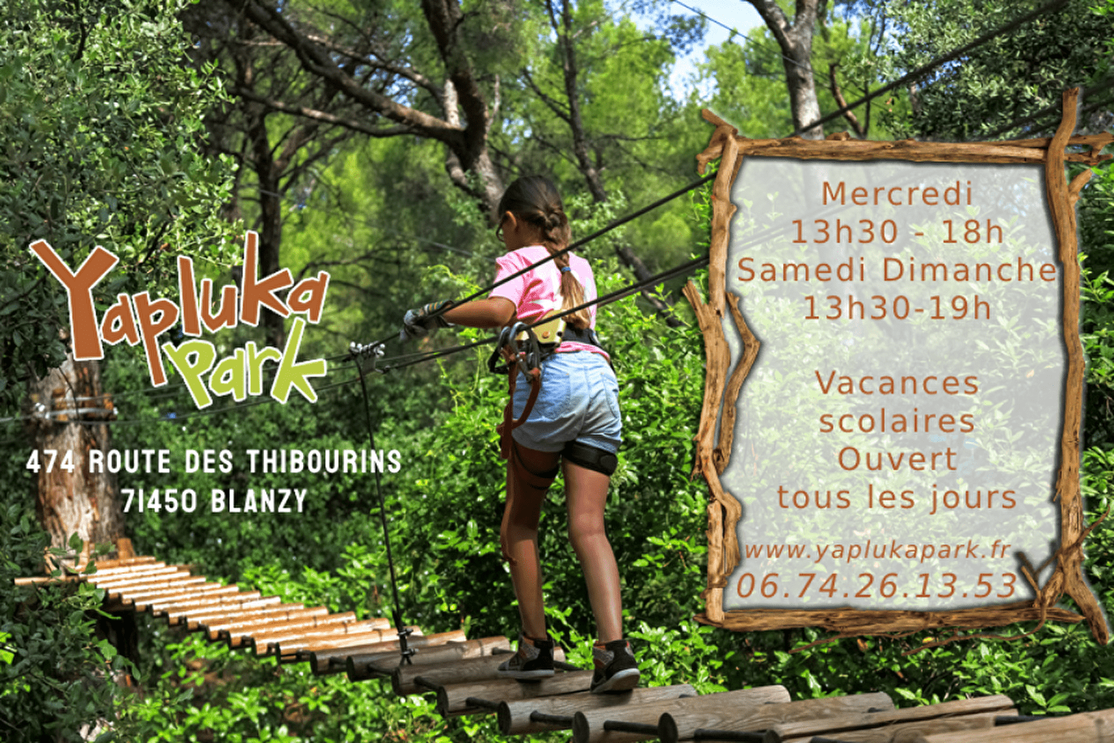 Vous trouverez à Yapluka Park différents parcours acrobatiques et de nombreuses formules pour les familles ou les sorties entre amis (anniversaires, cousinades, enterrements de vie de célibataire) ; un accueil professionnel, chaleureux et pédagogique pour les sorties scolaires (dès la maternelle), pour les associations et les entreprises ; aire de pique-nique, parking ombragé, toilettes...